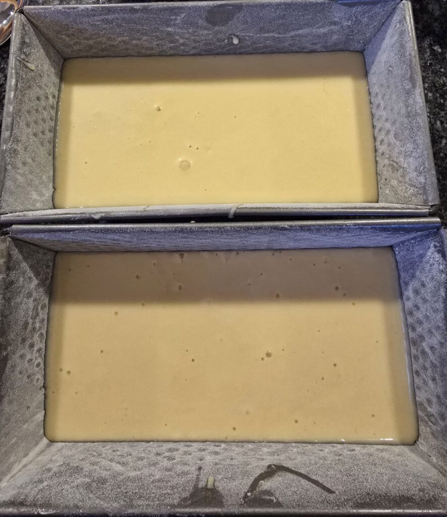 Bei 160 Grad Umluft ca. 53 Minuten backen (wenn zwei kleinere Formen) und mit einem Stäbchen an mehreren Stellen testen, ob der Kuchen durch gebacken ist.